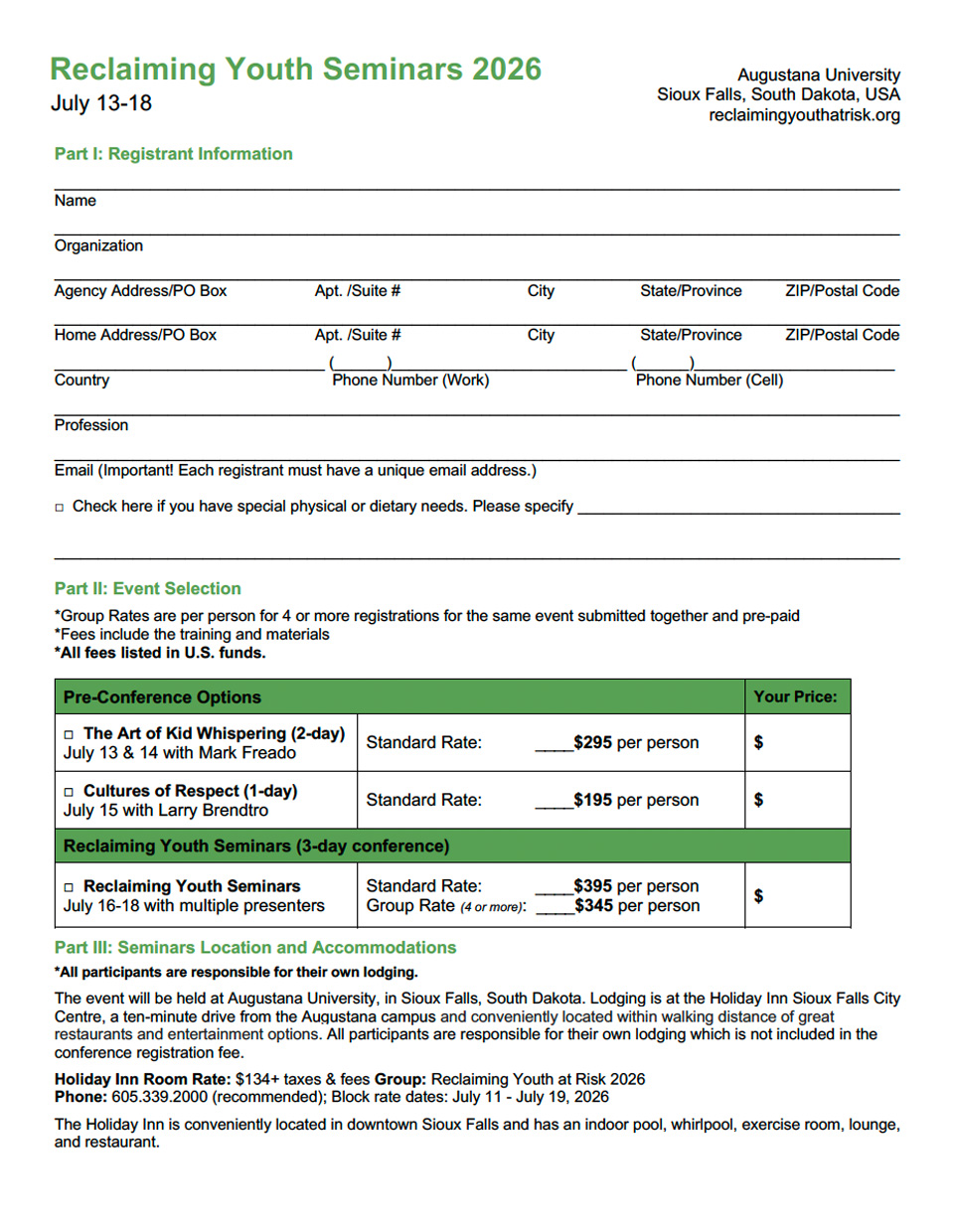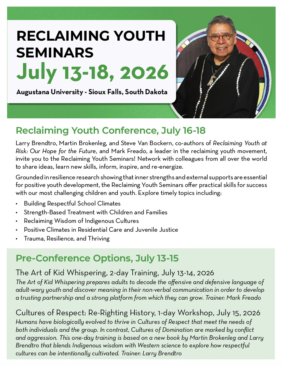 Larry Brendtro, Martin Brokenleg, and Steve Van Bockern, authors of Reclaiming Youth at Risk, and Mark Freado, a leader in the reclaiming youth movement, invite you to attend the Annual Reclaiming Youth Seminars! The 2026 seminars will be held July 13-18, at Augustana University in Sioux Falls, South Dakota, and will run from 8:30 AM to 4:30 PM daily.
